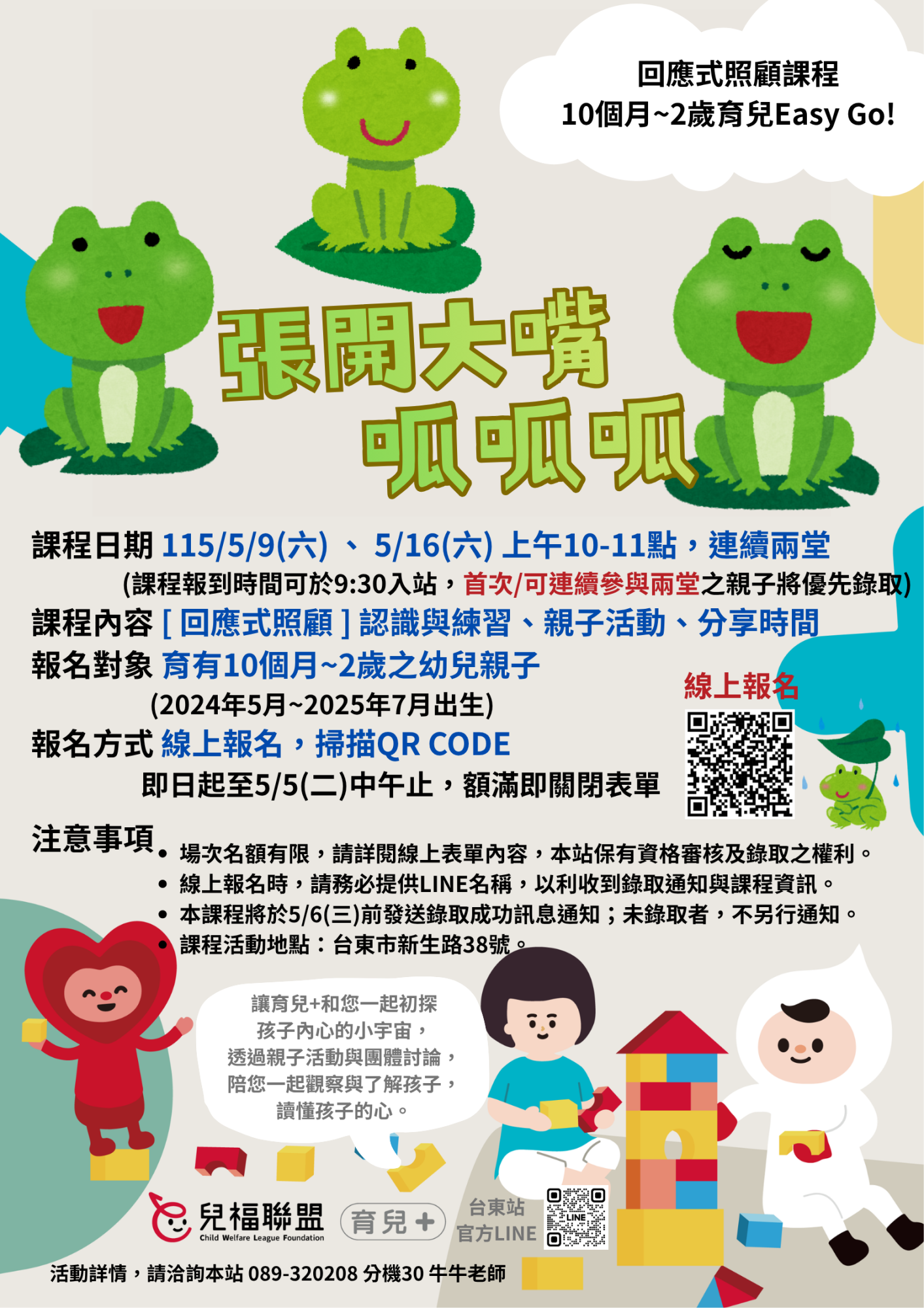 本報名填寫表單送出後,請傳送『幼兒姓名/年紀,我是OO的爸爸或媽媽,已報名回應式照顧課程』文字內容至育兒+台東站官方LINE,經站點後台確認後回覆『已收到報名 』通知訊息,才算報名成功唷!