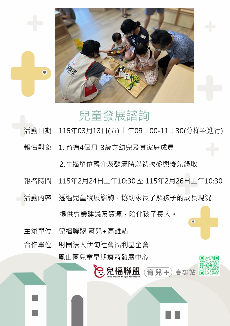 - 於高雄站官方LINE(@442utxjk)留言,我要報名『兒童發展諮詢』。