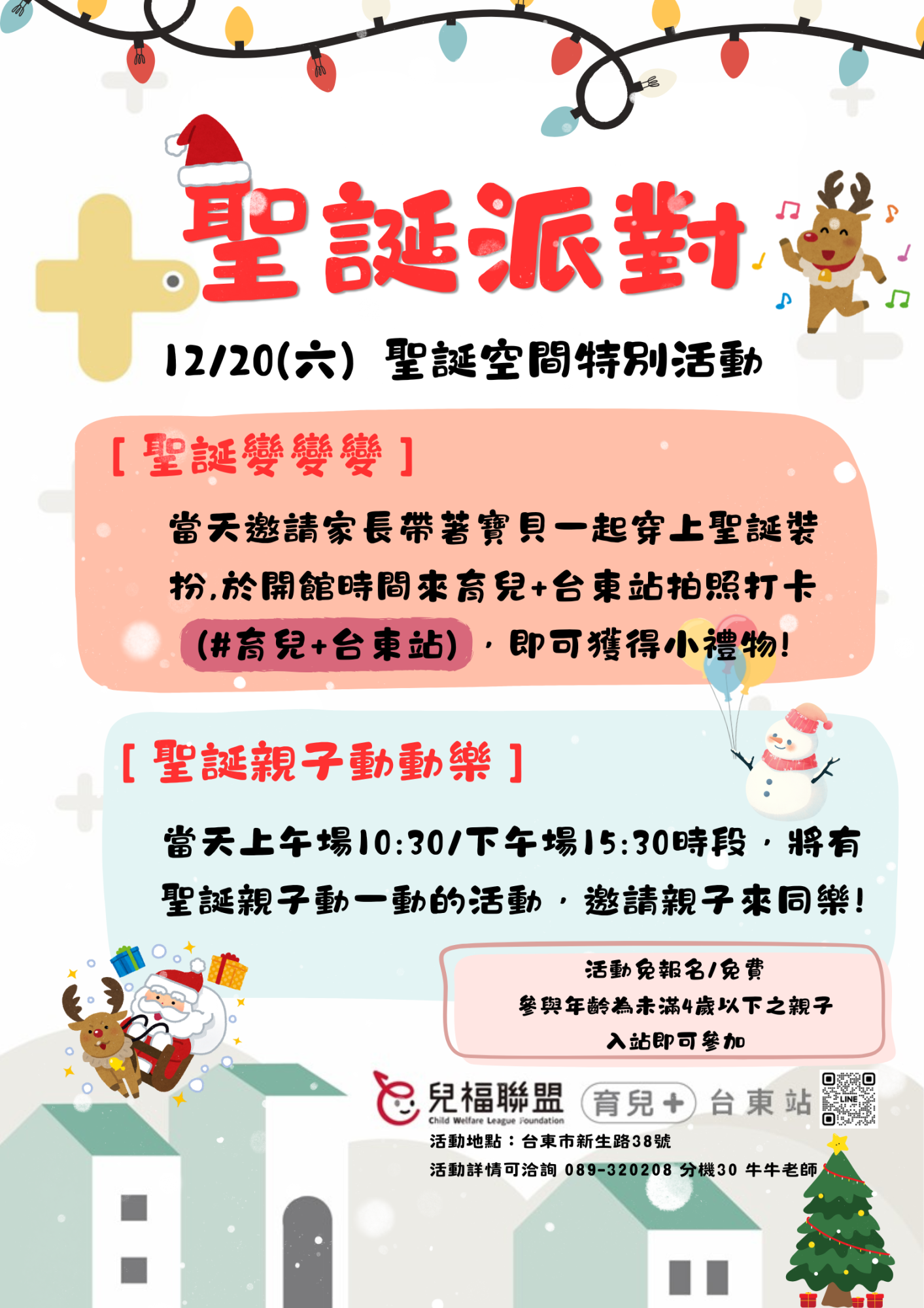 邀請育兒+0-3歲的親子們穿上可愛聖誕裝扮,一起來空間派對,並打卡分享親友,當日特別空間活動時段育兒+老師也會帶領親子,和我們一起透過親子動一動來歡慶聖誕節唷!!