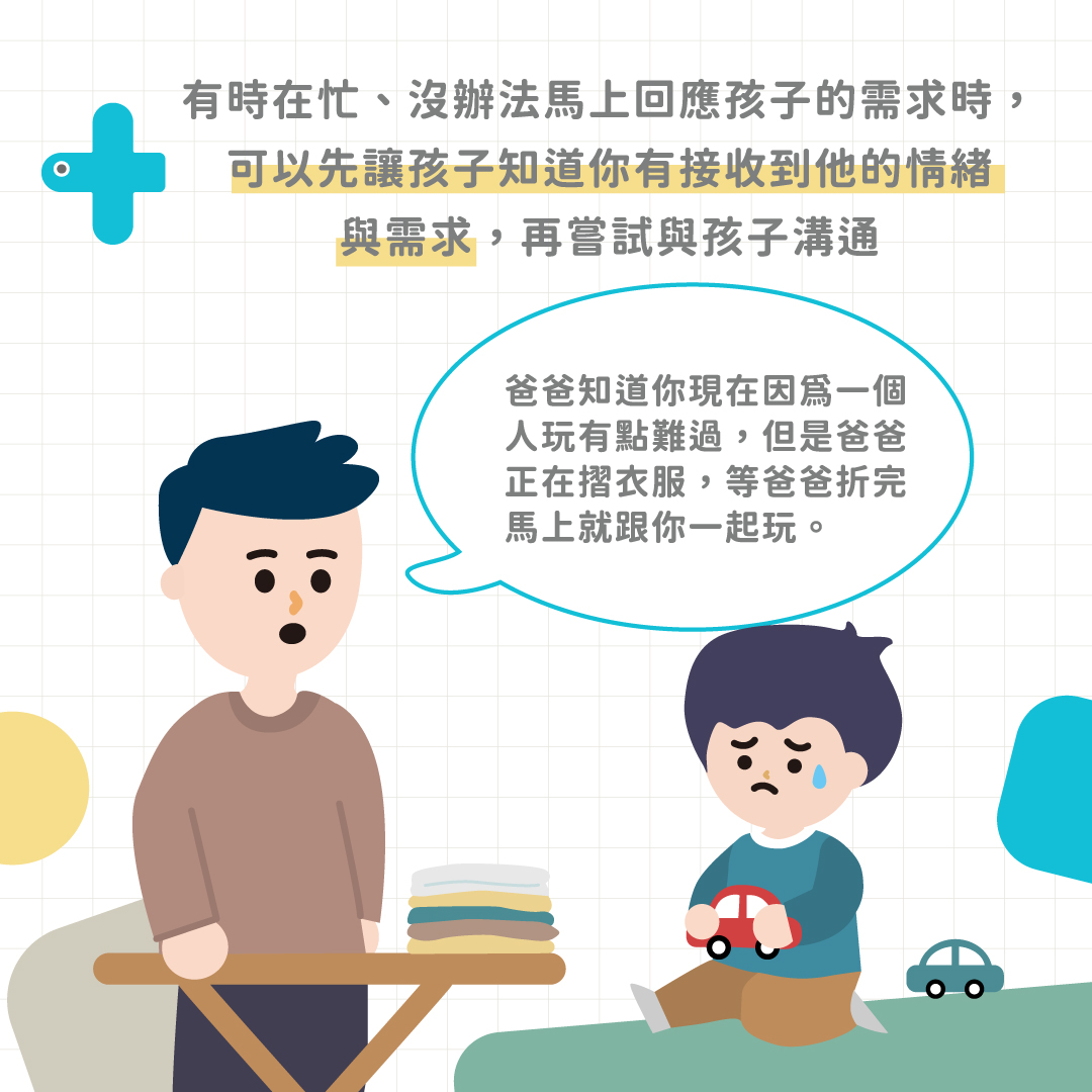 當孩子提出「陪我玩」的需求時,若當下在忙或是很累、無法及時同樂,可以先給孩子一個回應,讓他知道大人有接收到他的情緒與需求。例如:「爸爸知道你現在因為一個人玩有點難過,但是爸爸正在摺衣服,等爸爸摺完馬上就跟你一起玩。」「媽媽現在有一點累,可以讓媽媽坐在沙發上休息10分鐘,休息完再跟你一起玩嗎?」