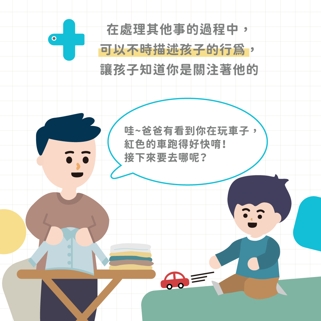 在處理其他事的過程中,也可以不時描述孩子的行為,讓孩子知道你是關注著他的。這麼做的用意,是為了透過語言、眼神與態度等等,向孩子傳遞「我有看見你的需求」、「我理解你」,也幫助他學會等待。 - 從平時建立「陪玩儀式」