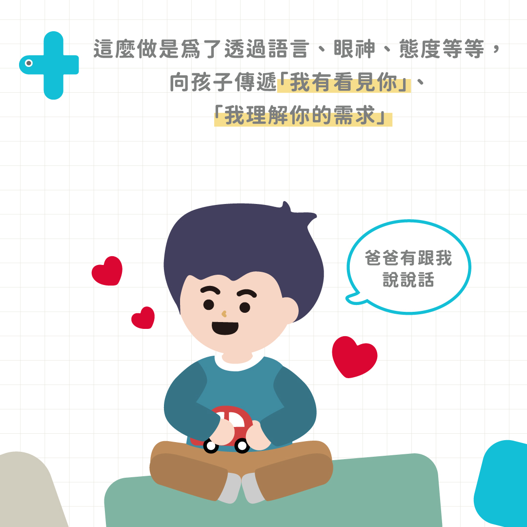 對孩子而言,當他們主動呼喚、邀請大人時,大人的回應——一個眼神、微笑或是一句話。都能讓他們感受到彼此的情感連結,讓他們感受到自己「有被看見」。