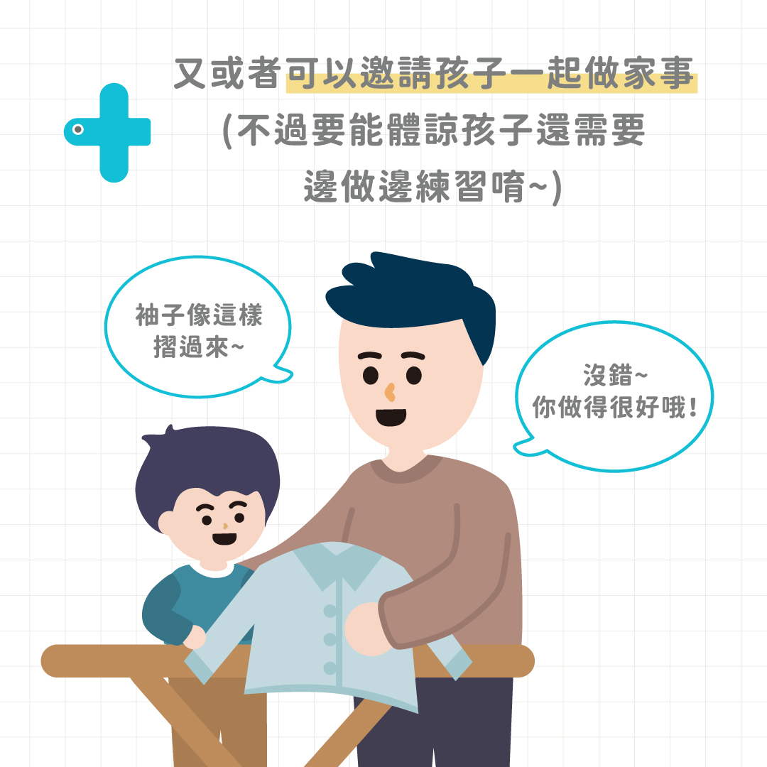 若是孩子能夠幫忙的話,可以邀請孩子加入照顧者正在做的事。像是在收衣服時,可以將一兩件衣服交給孩子拿著,再一起走到衣櫃前;摺衣服時,可以邀請孩子幫忙將衣服的袖子摺起來。
